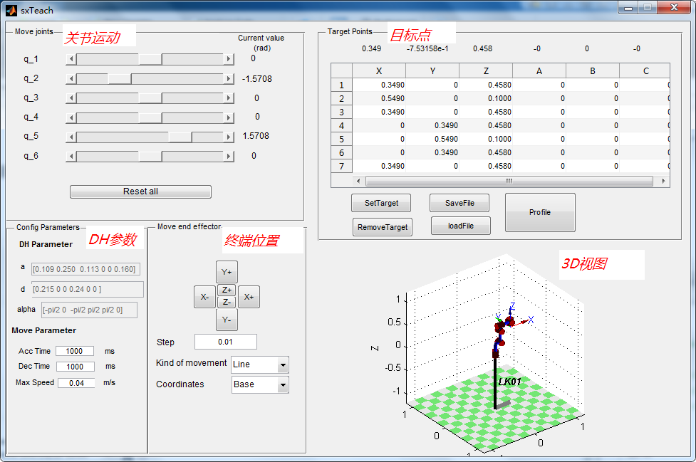 基于Matlab开发的六关节机器人的轨迹规划仿真软件sxTeach,为学生初步学习机器人轨迹规划和运动学正逆解算法提供了离线仿真环境。试验界面如下图所示,可以完成如下功能: