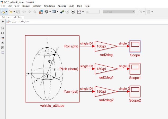 Step4: 手动摆动四旋翼,在Simulink监控界面观察上传的四旋翼姿态数据