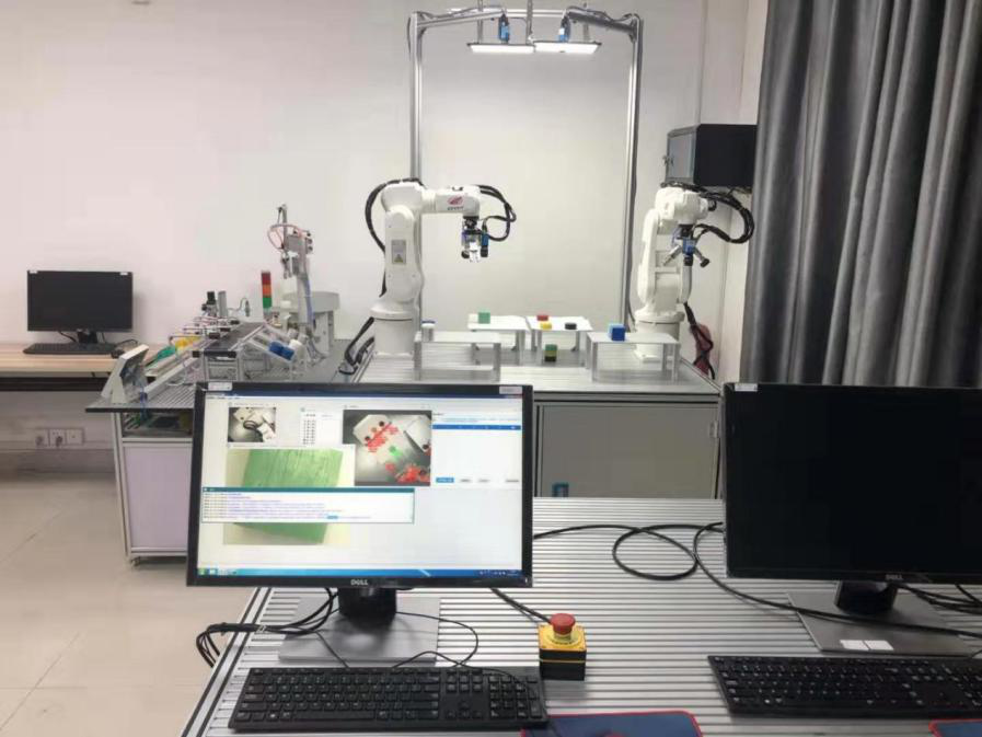 六自由度机器人双机协同实验平台是我公司与华侨大学、暨南大学合作建设的项目,该平台可以完成工业六自由度机器人双机协作运动控制、机器视觉检测以及光机电实训等内容,对六关节机器人的轨迹规划、空间插补算法、正/逆运动学解算、末端力矩控制、机器视觉及处理等机器人控制理论算法的研究,提供快速验证平台。本项目中包含2套工业级六自由度机械臂、1套光机电平台、2套实时仿真系统、2套视觉定位系统。