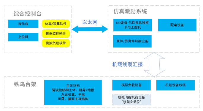 为满足某初创电动航空公司对eVTOL飞控系统的敏捷开发需求,拟搭建一套铁鸟综合实验平台,按飞机研制进度的功能需求,整体应用场景分为两个部分,一部分是航电飞控系统的功能试验,另一部分为配置负载模拟系统的飞控系统性能试验。